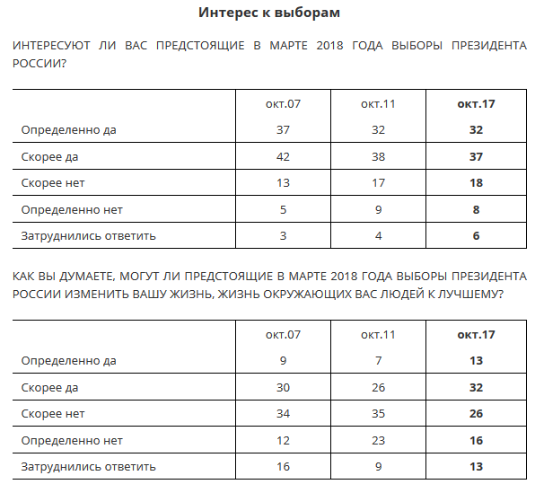 В целом на вопрос, интересуют ли вас предстоящие в марте 2018 года выборы президента России, 32% опрошенных ответили "определенно да", 37% сказали "скорее да", 8% респондентов не интересуются выборами вообще.