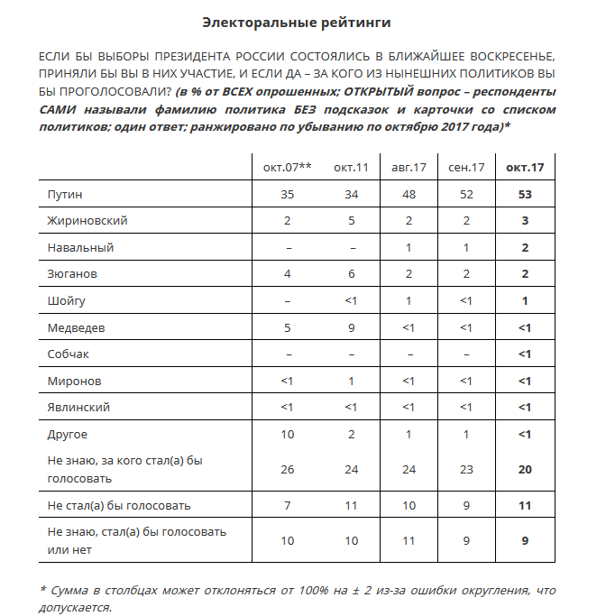 Отмечается, что опрос методом личного интервью был проведен 20–24 октября 2017 года по репрезентативной всероссийской выборке городского и сельского населения среди 1600 человек в возрасте 18 лет и старше в 137 населенных пунктах 48 регионов страны.