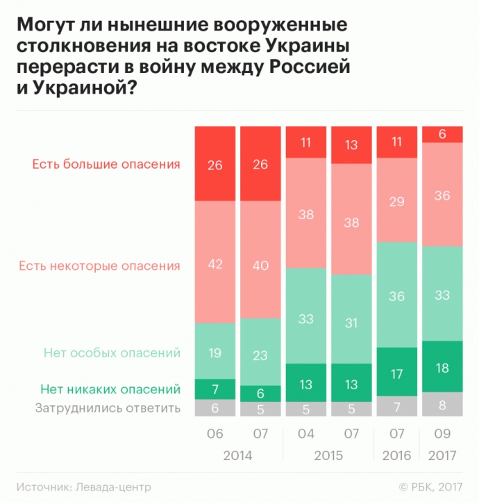 При этом доля россиян, опасающихся, что вооруженные столкновения на востоке Украины могут перерасти в войну между Москвой и Киевом, остается стабильной. В сентябре 2017 года в той или иной мере этого опасались 42% респондентов, в июле 2016-го – 40%.
