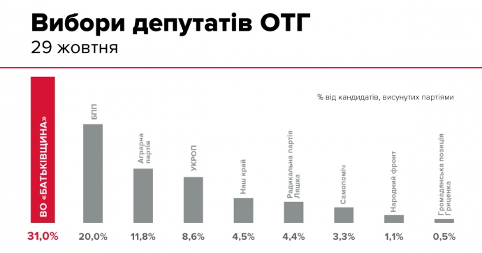 Отмечается, что от "Батькивщины" избраны 880 депутатов в ОТО (31%), от БПП – 568 (20%), от Аграрной партии – 334 (11,8%), от "Укропа" – 245 (8,6%).