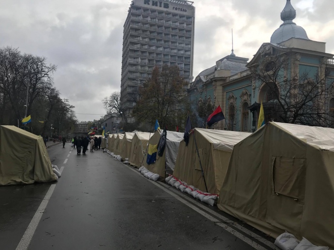 Палаточный городок представителей батальона "Донбасс" по Грушевского огражден заборами и грузовиками Национальной гвардии. Самих представителей Нацгвардии на месте не видно.
