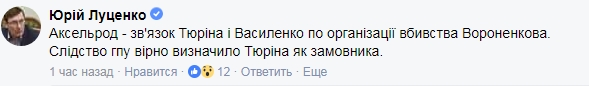 "Аксельрод - связь Тюрина и Василенко по организации убийства Вороненкова. Следствие ГПУ верно определило Тюрина как заказчика", - заявил он.