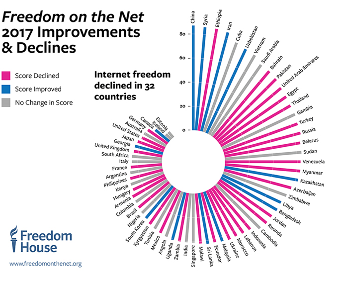 Больше всех ущемляли свободу в интернете Китай, Сирия, Эфиопия и Иран, меньше всех – Эстония, Исландия и Канада.