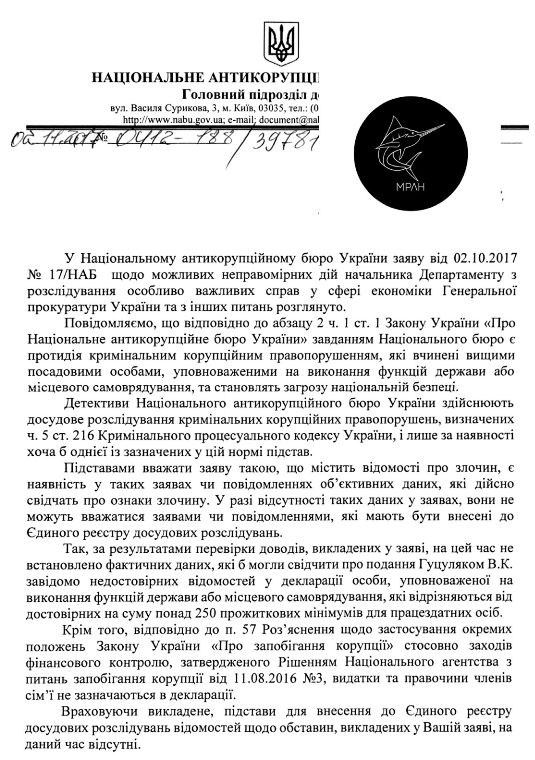 "В настоящее время не установлено фактических данных, которые могли бы свидетельствовать о представлении Гуцуляком В.К. заведомо недостоверных сведений в декларации, которые отличаются от достоверных на сумму более 250 прожиточных минимумов для трудоспособных лиц", – отметили в бюро.