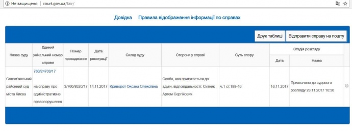 Дело будет рассматривать Соломенский районный суд Киева, начало рассмотрения - 28 ноября в 10:30.