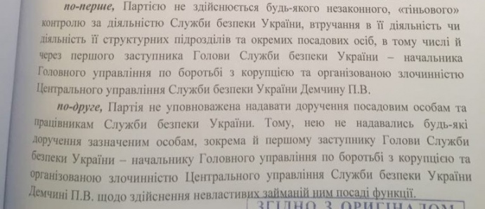 Адвокат Демчин предоставил суду письмо за подписью руководителя секретариата партии "Блок Петра Порошенко "Солидарность" Максима Саврасова, в котором говорится, что "партия не осуществляет какой-либо незаконный, "теневой" контроль над деятельностью Службы безопасности Украины... в том числе и через первого заместителя председателя Павла Демчину".