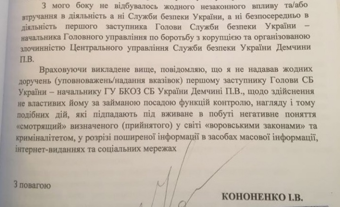 Тот утверждает, что лично никогда не давал Демчине никаких поручений, "которые подпадают под применяемое в быту негативное понятие "смотрящий", определенного в мире "воровскими законами". "С моей стороны не было ни одного незаконного влияния", - заверил в письме Кононенко.