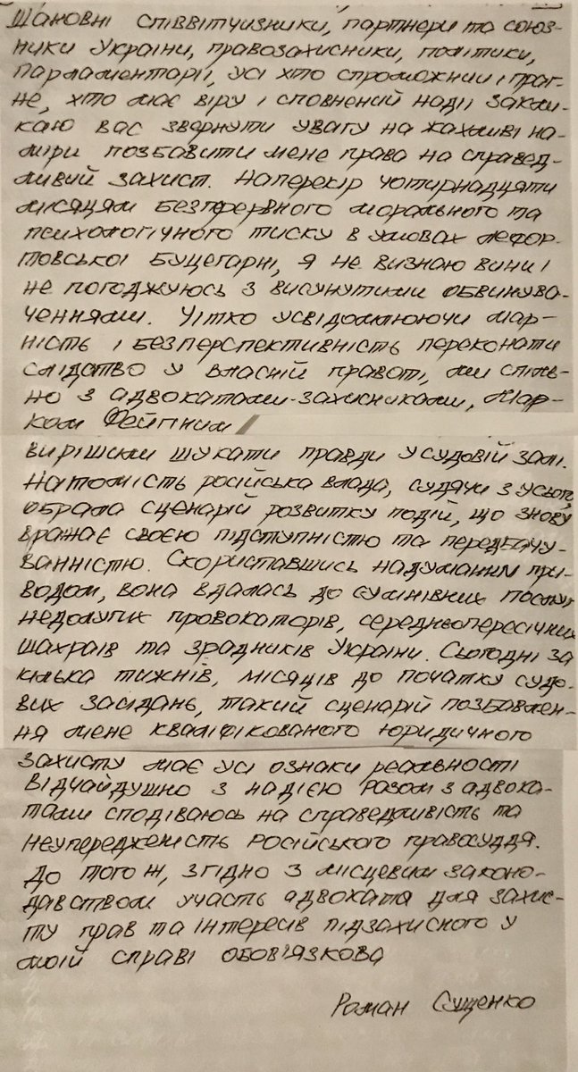 Защита незаконно удерживаемого в России украинского журналиста Романа Сущенко обжаловала продолжение его ареста.