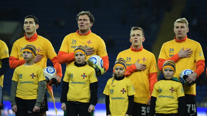 "Перед матчем дети воинов АТО вывели игроков на поле. Все они были в специальных футболках с эмблемой ВСУ и надписью "26 лет. Гордимся", - говорится в сообщении.