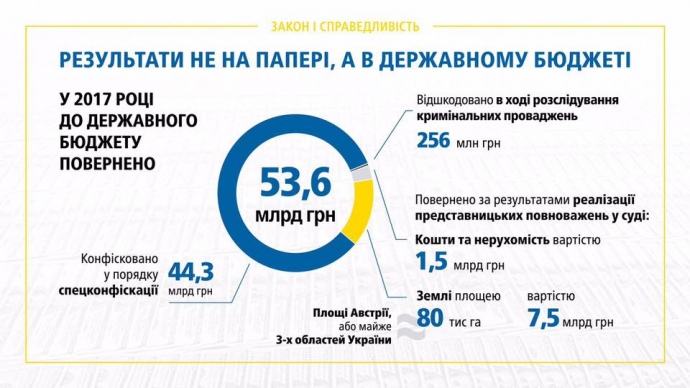 По его словам, в бюджет возвращено 53 миллиарда гривен и 80 тысяч гектаров земли.