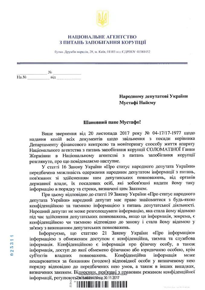 Национальное агентство предотвращения коррупции отказалось предоставить нардепу Мустафе Найему копии документов об увольнении Анны Соломатиной без письменного обязательства о неразглашении.