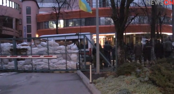 В Киеве неизвестные в камуфляже и балаклавах заблокировали телеканал NewsOne мешками с песком и колючей проволокой, заявляя, что не согласны с "политикой канала".