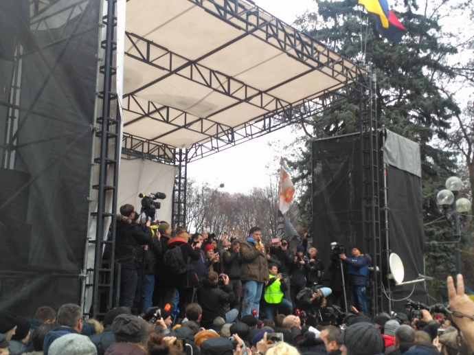 Тогда Саакашвили добавил: "А также увольнения руководства СБУ, которая выполняла эти преступные приказы". Люди снова начали кричать "отставка".