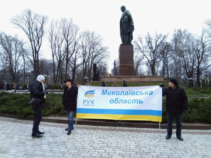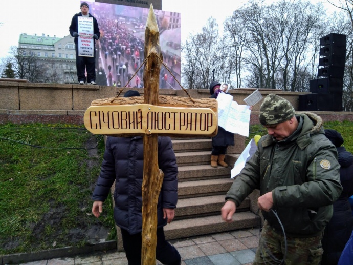Есть представители разных городов и регионов - Бердичев, Чигирин, Одесса, Полтава, Николаев, Прикарпатье. Также присутствуют люди с табличками "Импичмент".