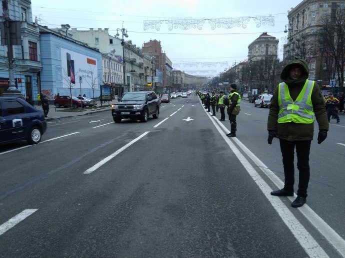 Полицейский в шеренге сообщил УП, что в это воскресенье они получили такое распоряжение - оставить проезжей одну часть. Обычно Крещатик по воскресеньям полностью пешеходный.