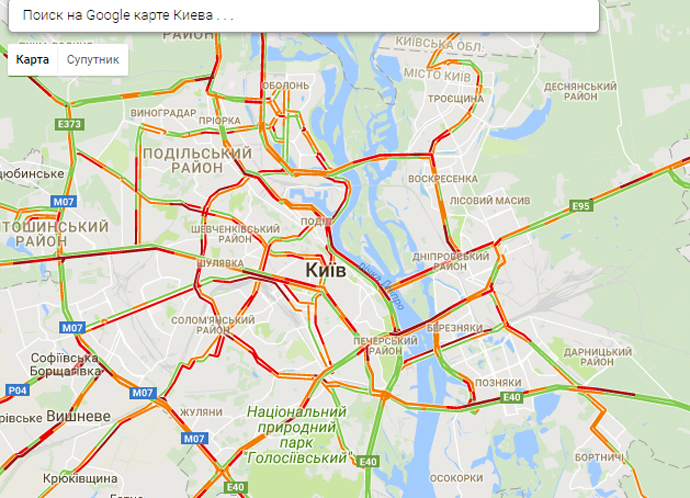 Об этом свидетельствуют данные карты пробок от Google.
