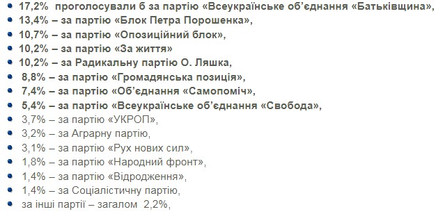 5% барьер преодолели бы также "Блок Петра Порошенко", "Оппозиционный блок", "За життя", Радикальная партия Ляшко, "Гражданская позиция", "Объединение "Самопомич", "Всеукраинское объединение "Свобода".