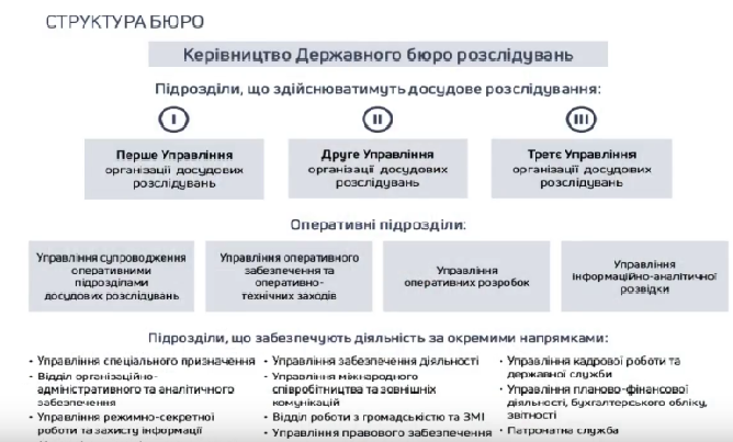 Он отметил, что организационная структура бюро уже согласована с Кабинетом Министров и будет состоять из центрального аппарата, в состав которого войдет 19 отделов и управлений, 7 территориальных управлений, академия и научно-исследовательский институт.