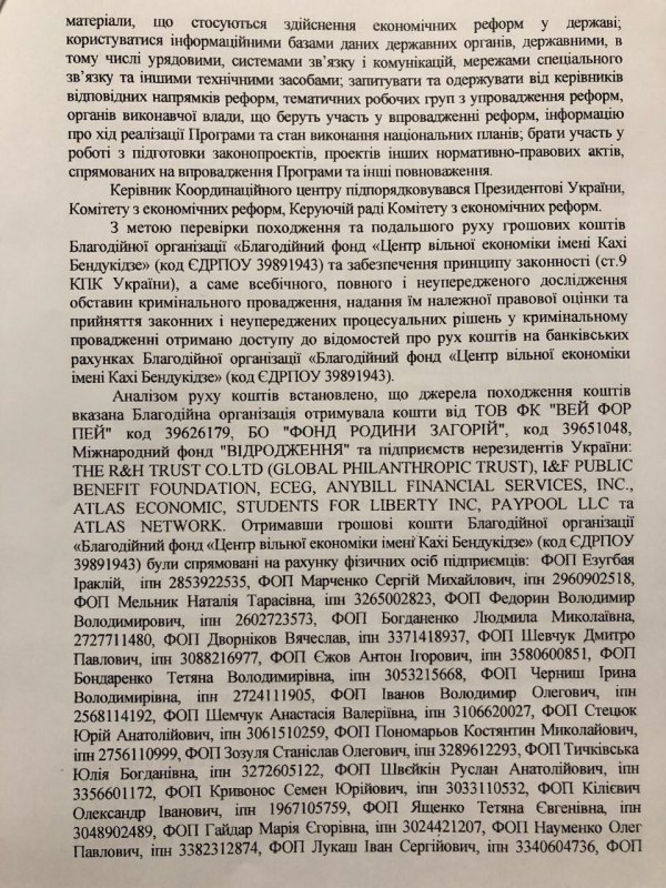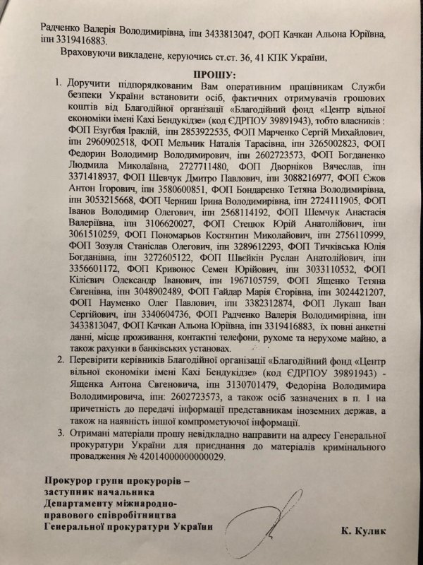 В частности Кулик поручил проверить "Центр Бендукидзе" "на причастность к передаче информации представителям иностранных государств, а также наличие другой компрометирующей информации".