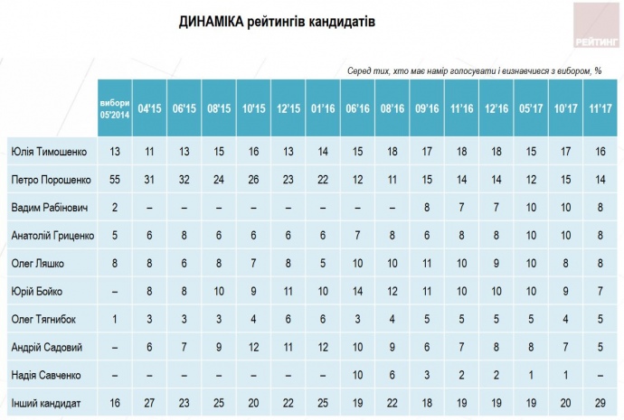 В президентском рейтинге социологической группы "Рейтинг" лидирует Юлия Тимошенко, за ней следуют Петр Порошенко и Святослав Вакарчук.