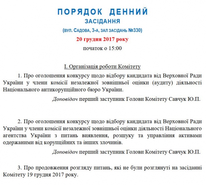 Решение о конкурсе на аудитора Национального антикоррупционного бюро Украина комитет принять не смог.