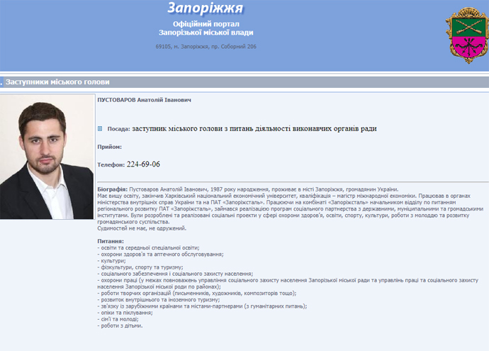 Согласно сайту Запорожской городской власти, у мэра Запорожья есть 7 заместителей. 30-летним в этом списке является Анатолий Пустоваров.