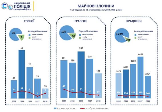 В частности, говорят в ведомстве, в период с 30 декабря по 1 января в стране зарегистрированы 5,6 тысячи уголовных правонарушений. Так, на территории страны было совершено 13 разбойных нападений (по сравнению со средним зафиксированным показателем - 33), 131 грабеж (в среднем - 195), 2404 кражи (в среднем - 3250).