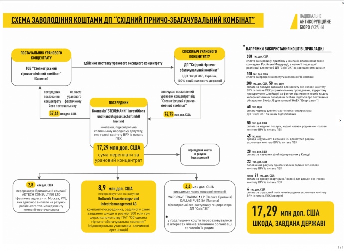 По данным следствия, ГП "Восточный горно-обогатительный комбинат" заключило контракт на поставку уранового концентрата с компанией-посредником, подконтрольной бывшему народному депутату, экс-председателю комитета Верховной Рады по вопросам топливно-энергетического комплекса, ядерной политики и ядерной безопасности.