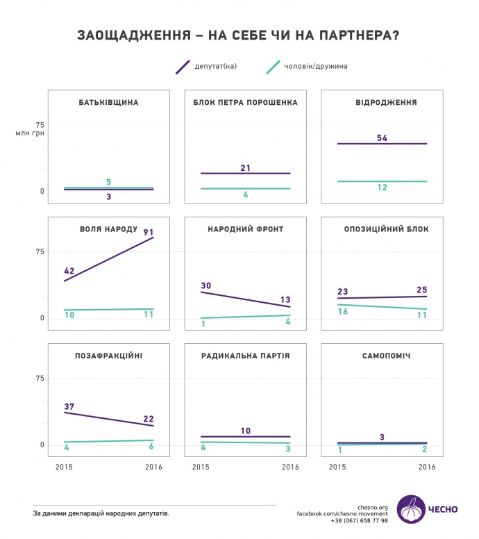 Однако во фракции партии "Батькивщина" картина противоположная - народные избранники этой фракции имеют сбережения примерно на четверть меньше, чем их супруги.