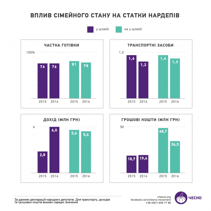 "Существует отрицательная зависимость между семейным статусом и количеством денежных активов в этот момент. Модель показывает, что если депутат ка) женится/выходит замуж, то его (ее) денежные активы снижаются на 8,4 миллиона гривен", - отмечают журналисты.