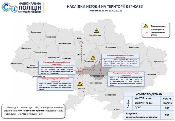 В свою очередь в МВД Украины сообщили, что по состоянию на 13:00 20 января осложненным остается движение большегрузого и крупногабаритного автотранспорта на автодорогах в Кировоградской области.