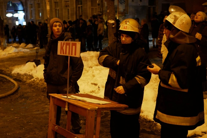 Также на улице возле горящего здания очень скользко, поскольку на улице мороз, а у пожарных произошла утечка воды из одного из шлангов.