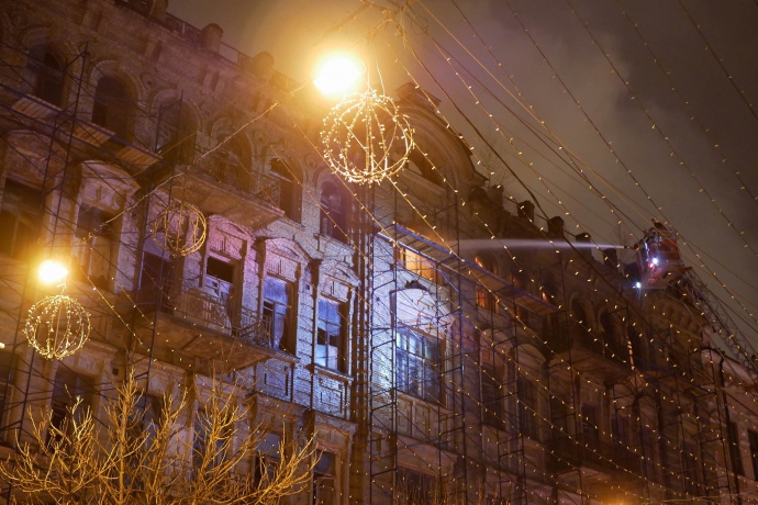 В центре Киева по ул. Богдана Хмельницкого, 12/14 горит старинный отселенный дом.