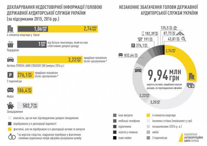 "Приведенная в отношении меня НАБУ информация является сугубо субъективным мнением детективов, которые подсчитали мое состояние и просчитали мои доходы и расходы за 20 лет моей жизни, полагаясь на собственное мнение", – заявила руководитель Государственной аудиторской службы.