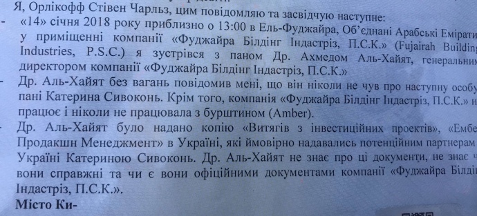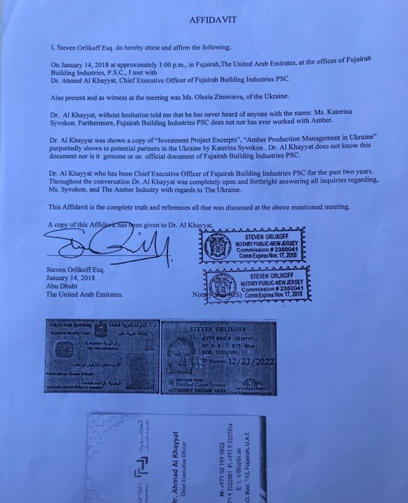 В письме от имени нотариуса Стивена Орликоффа из Абу-Даби говорится, что 14 января 2018 года приблизительно в 13:00 в городе Эль-Фуджайра ОАЭ в помещении компании "Фуджайра Билдинг Индастриз" он встретился с гендиректором компании др. Ахмедом Аль-Хайятом.