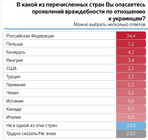 При этом на вопрос "В какой из перечисленных стран Вы опасаетесь проявлений враждебности по отношению к украинцам?" 34,4% выбрали РФ, 7,2% - Польшу, 4,2% - Беларусь.