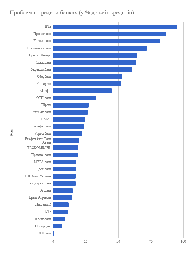 Возглавляют рейтинг банков с наибольшим процентом неработающих кредитов "дочка" российского Внешторгбанка (95,3%), государственный Приватбанк (86,9%) и Укрсоцбанк (81,84%).