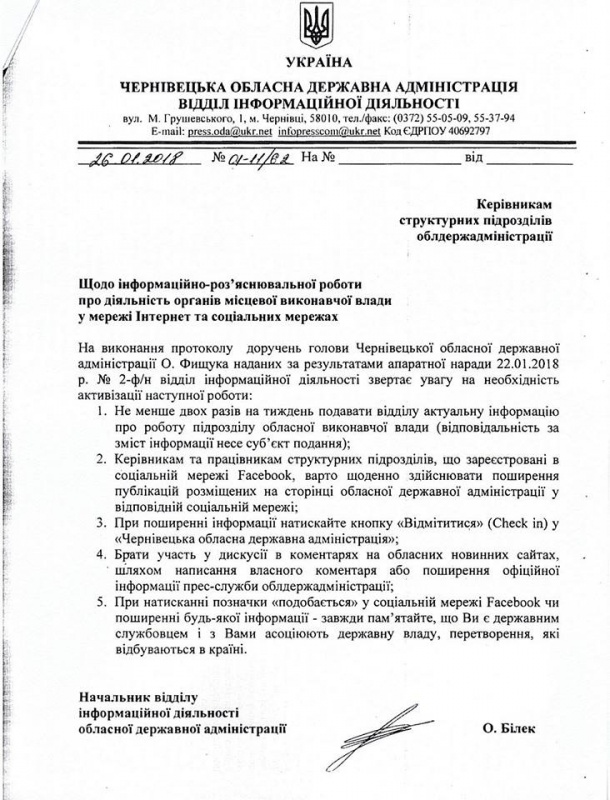 Соответствующие рекомендации, пишет издание, содержатся в специально разработанном документе. Чиновникам советуют "не менее двух раз в неделю подавать актуальную информацию о работе подразделения областной исполнительной власти". Им также рекомендуют ежедневно распространять публикации, размещенные на странице Черновицкой ОГА в Facebook.