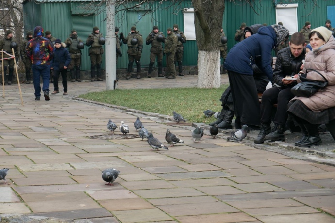 На Десятинке во время акции против храма УПЦ МП полиция задержала и отпустила мужчину, подозревая, что при нем - дымовая шашка, которую он может применить.