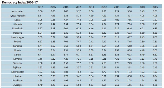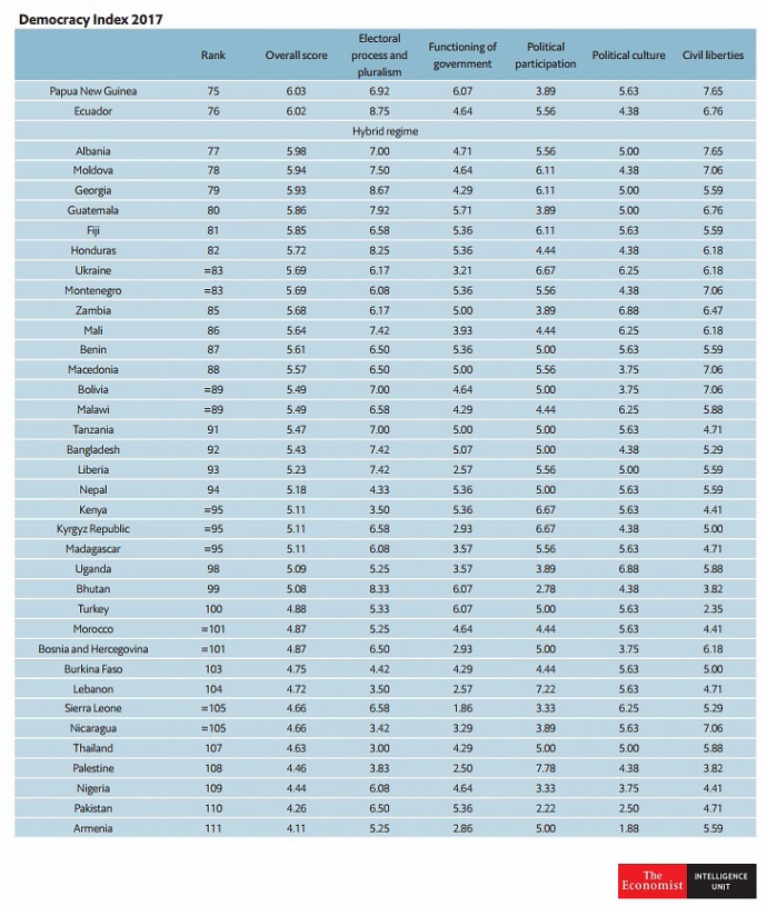 Украина заняла 83 позицию из 167 в рейтинге Democracy Index 2017, подготовленном организацией Economist Intelligence Unit.