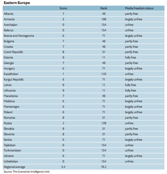Наибольшее количество баллов (10) получили страны с "полностью свободной" прессой: Австралия, Канада, Дания, Финляндия, Исландия, Швеция и США.