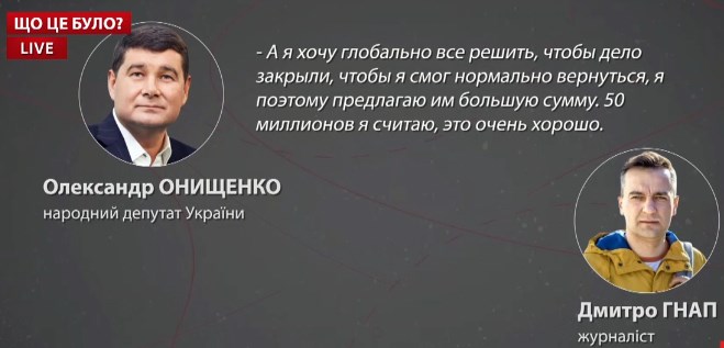 "И мне Злочевский жаловался: "Ты представляешь, вот Кононенко летает, я его прошу, там деньги получают, ничего не делают, им выгодно, чтобы я сидел где-то вдалеке и по миллиончику в месяц с меня брать и не пускать меня. Я хочу глобально все решить, чтобы дело закрыли, чтобы я мог нормально вернуться. Поэтому я предлагаю им большую сумму. $ 50 млн, я считаю, очень хорошо"- процитировал Злочевского Онищенко.