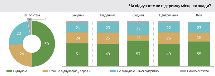 Так, на вопрос "Чувствуете ли вы поддержку местной власти?" 50% опрошенных ответили утвердительно. Еще 24% выбрали вариант "Раньше чувствовал(а), сейчас нет". 23% ответили, что не ощущают никакой поддержки.