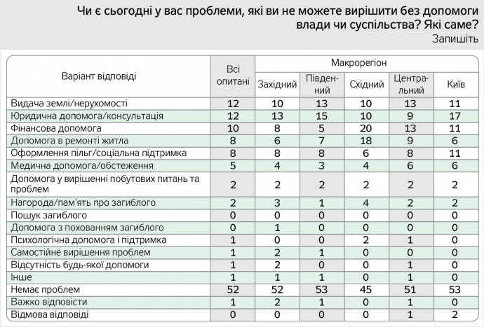 52% ответили, что не имеют таких проблем. В то же время по 12% отметили проблемы с выдачей земли или недвижимости и юридическую помощь.