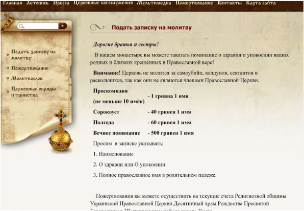 В сюжете отмечается, что "Десятинный монастырь" на своем сайте выложил официальный прайс-лист со стоимостью упоминания прихожан в молитвах.