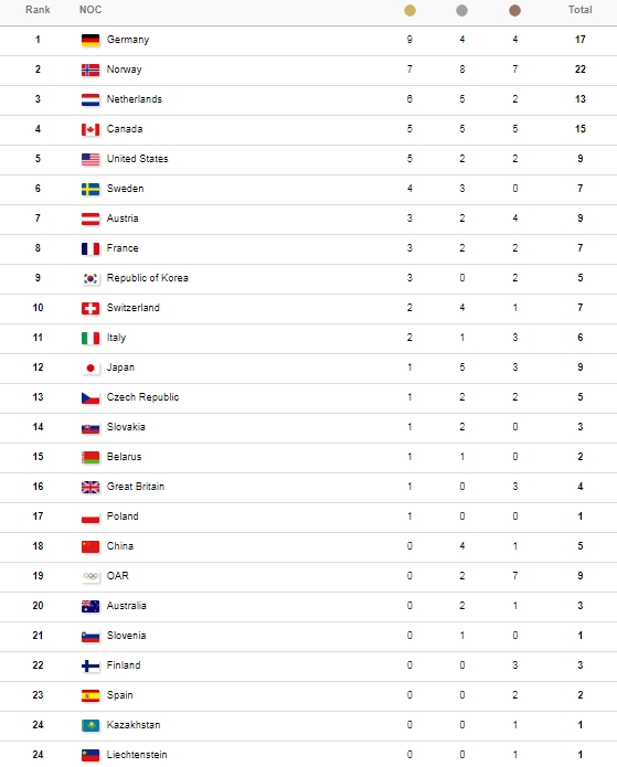 В медальном зачете на зимних Олимпийских играх в южнокорейском Пхенчхане сборная Германии продолжает удерживать лидерство.