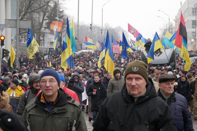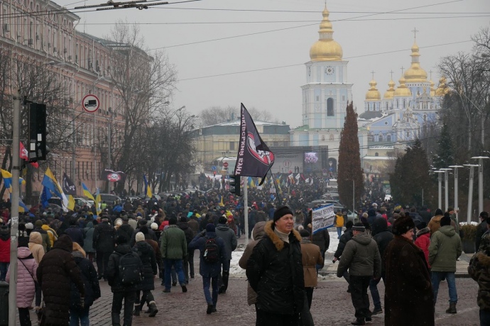 Люди выкрикивают "Отставка", "Киев, вставай!". Конфликтов замечено не было.