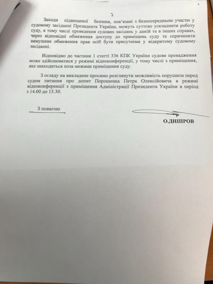 Прокуроры подали в Оболонский райсуд Киева ходатайство о допросе президента Петра Порошенко в качестве свидетеля в режиме видеоконференции из здания Администрации главы государства.