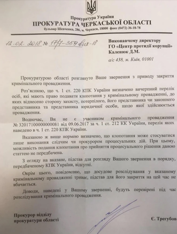 После этого производство против ЦПК открыла Государственная фискальная служба. Позже выяснилось, что дело передали в Генеральную прокуратуру, а затем в черкасскую.