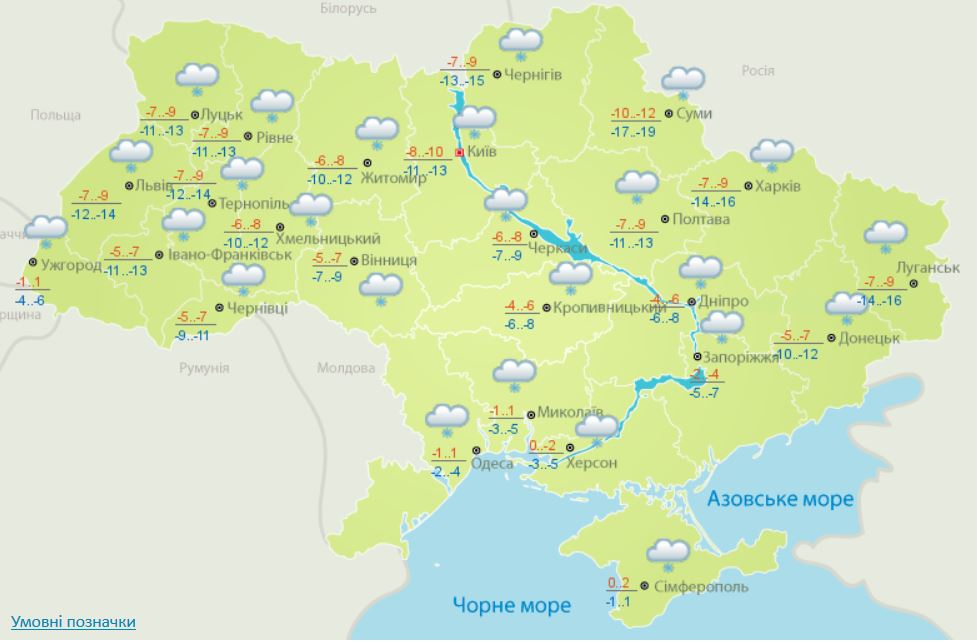 Температура ночью 10-15°, на севере Левобережья 16-21°, днем 6-11° мороза; в большинстве центральных областей ночью 5-10°, днем 3-8° мороза; в южной части и на Закарпатье ночью 2-7° мороза, днем около 0°.